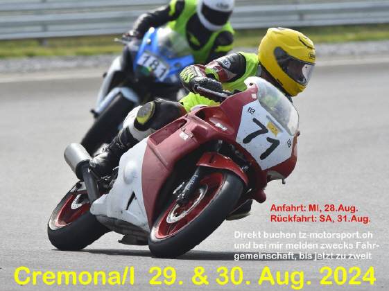 Da leider die Veranstaltung an Auffahrt in Chenevières wegfällt (ich liebe diese Rennstrecke!), startet die Saison bei tz-motorsport mit einem zwei-tägigen Event erst Ende Mai. Dort haben wir uns (momentan zu fünft, Stand: 3.1.2024) für Ende Mai angemeldet. Bei www.freeride-training.com, ebenfalls Berufskollegen von mir, wurde ich fündig. Da ich Cremona anfangs Mai als Wetter-bedingt gut beurteile, habe ich mich nun definitiv angemeldet. Wer sich noch kurz entschliesst dafür (1-2 Personen) kann sich bei Koni & Sepp melden, nicht vergessen meinen Namen zu nennen. Es pressiert!