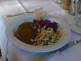 Im Gasthaus «Ziel» habe ich über Jahre, teilweise mehrmals pro Jahr, einige Weiterbildungskurse für Ostschweizer Töff-Fahrlehrer erteilt: Dieses Haus, und besonders die Wirtsleute Rosmarie & Fridli Kobler, war mir eine zweite Heimat, wo ich immer gern zurück kam. Dass ich nun zu meinem Jubiläum mit meiner ganzen Kundschaft zu Gast war, erfüllte mich mit grosser Genugtuung. So war denn unser Einheitsmenü ein richtiges Festessen: Wildhackbraten des Hauses mit Ribel-Dinkelspätzli und Rotkraut. |