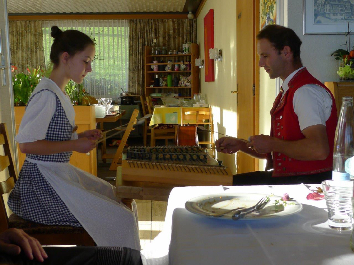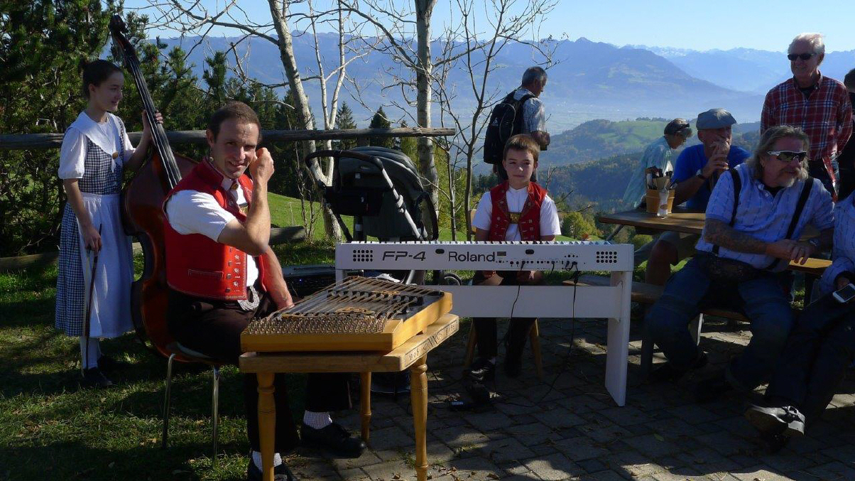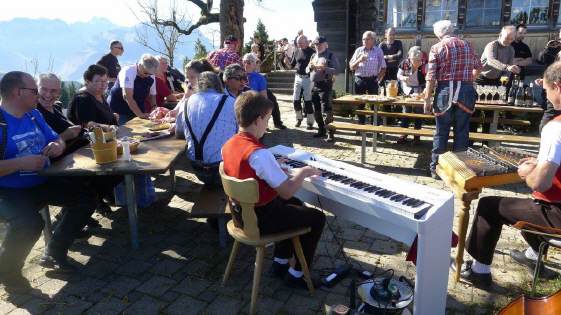 Die letzten 200 Meter vom Parkplatz bis zum Gasthaus mussten noch zu Fuss zurückgelegt werden. Auf dem Hirschberg erwartete uns der Apéro mit einer engagierten Appenzeller Hausmusik, die von Bruno Kessler, am Hackbrett und Bass, mit seiner Tochter Anja, am Bass und am Hackbrett und dem Sohn Florian am E-Piano besetzt war. Da es schon hunderte an anderen Gästen gab bei diesem traumhaften Wetter, mussten wir dann fast um unsere Tische kämpfen.
