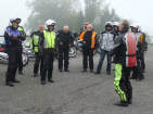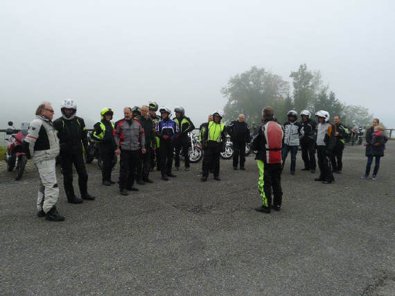 Von der Fähre dem See entlang bis nach Stäfa dominierte weiterhin das Grau, aber über dem See machten sich erste Löcher bemerkbar, wo die Sonne drückte. Meine Hoffnung stieg, dass es bis zu unserem Start um 11 Uhr schönes Wetter sein dürfte. Als ich in der Wanne eintraf, war ich natürlich nicht der erste – aber immer noch rechtzeitig, um ein planloses Parkieren der Maschinen zu verhindern. So stellten dann alle den Töff auf den vorgesehenen Parkplatz unterhalb der Strasse. So konnten wir dann gut die Gruppen bei der Abfahrt bilden und mussten nur nach rechts einbiegen. Aber dies wussten ja nur die Tourguides, denn niemand ausser ihnen konnte ahnen, wo uns diese «Fahrt ins Blaue» mit unbekannten Ziel hinführen würde.