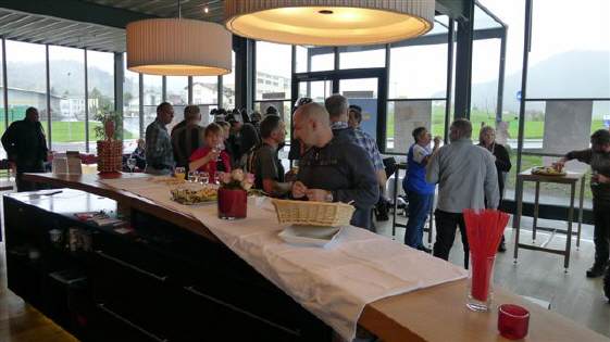Nach und nach trafen auch die übrigen Gruppen ein und legten ihre nassen Kleider ab. Zum Apéro luden zwei der berühmten Käseplatten von Preisig, Richterswil ein sowie herrliche kleine Häppchen von der ortsansässigen Bäckerei Schefer, die mir von Franz empfohlen wurde. Umrahmt wurde das Ganze mit einer wunderbaren Früchteplatte, inmitten einer Galerie an halbgefüllten Gläsern mit Weisswein, Wasser und Orangenjus. Da die meisten mit einem vollen Bauch angefahren kamen, stürzten sich nicht alle gleich auf die Platten und so gaben sie auch länger noch etwas für die Augen her! |