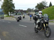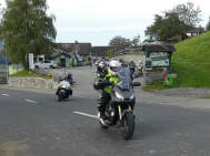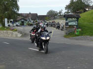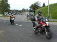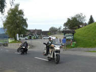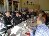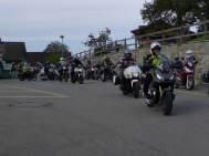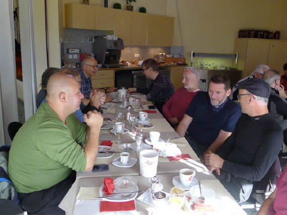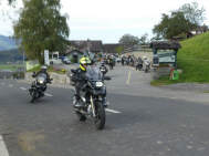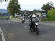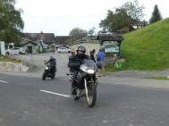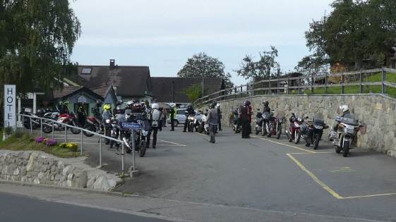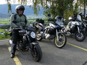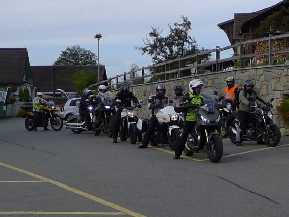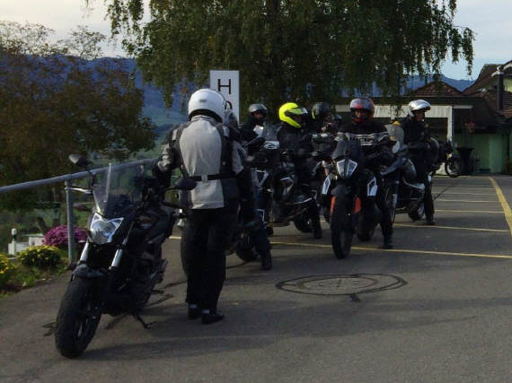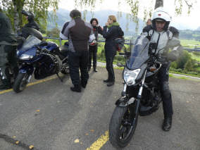 So gegen halb 11 Uhr besprach ich mich mit meinen Tourguides, die die Strecke schon vorher abgefahren hatte. Danach begrüsste ich offiziell alle Gäste, wovon Bernhard ein Filmchen machte. (Ausschnitt des nicht ganz scharfen Bildes) Dabei informierte ich über die Hruppenfahrregeln, die Tourguides mit ihren Gruppeneinteilungen und wie der ganze Tag ablaufen wird: «Fahrt ins Blaue», nur die Tourguides wissen, wo es langgeht. Da gab es ein Gelächter, denn Alain's Frau Sylvie hatte ihn begleitet, also wusste auch sie davon ... Ich gab 10 Minuten, um sich um 5 vor 11 Uhr zu besammeln und in den Gruppen aufzureihen. |