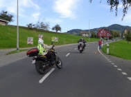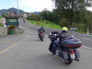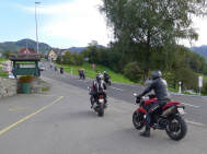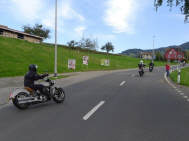 So gab es mit den 22 Maschinen drei Gruppen. Pünktlich um 11 Uhr startete die erste Gruppe, im 2 Minuten-Abstand folgten die übrigen. Erst ging es die kurvenreiche Strasse von Gommiswald hoch zum Rickenpass, danach hinunter nach Wattwil und Ebnat-Kappel: Dort begann unser Ausflug mit kleinen, unbekannten Strässchen, ohne Verkehr und immer wieder mit wunderbaren Aussichten in die Landschaft. Arthur landete auf dem Bendel (dort gibt es FREIHEIT einzuatmen!) und machte seinen Stundenhalt in der Höhe, wir übrigen trafen uns dazu am Bahnhof von Neu St. Johann-Nesslau. Da gab es die Möglichkeit, eine Toilette aufzusuchen.