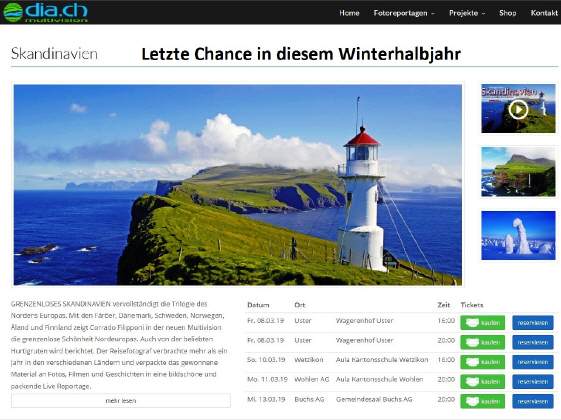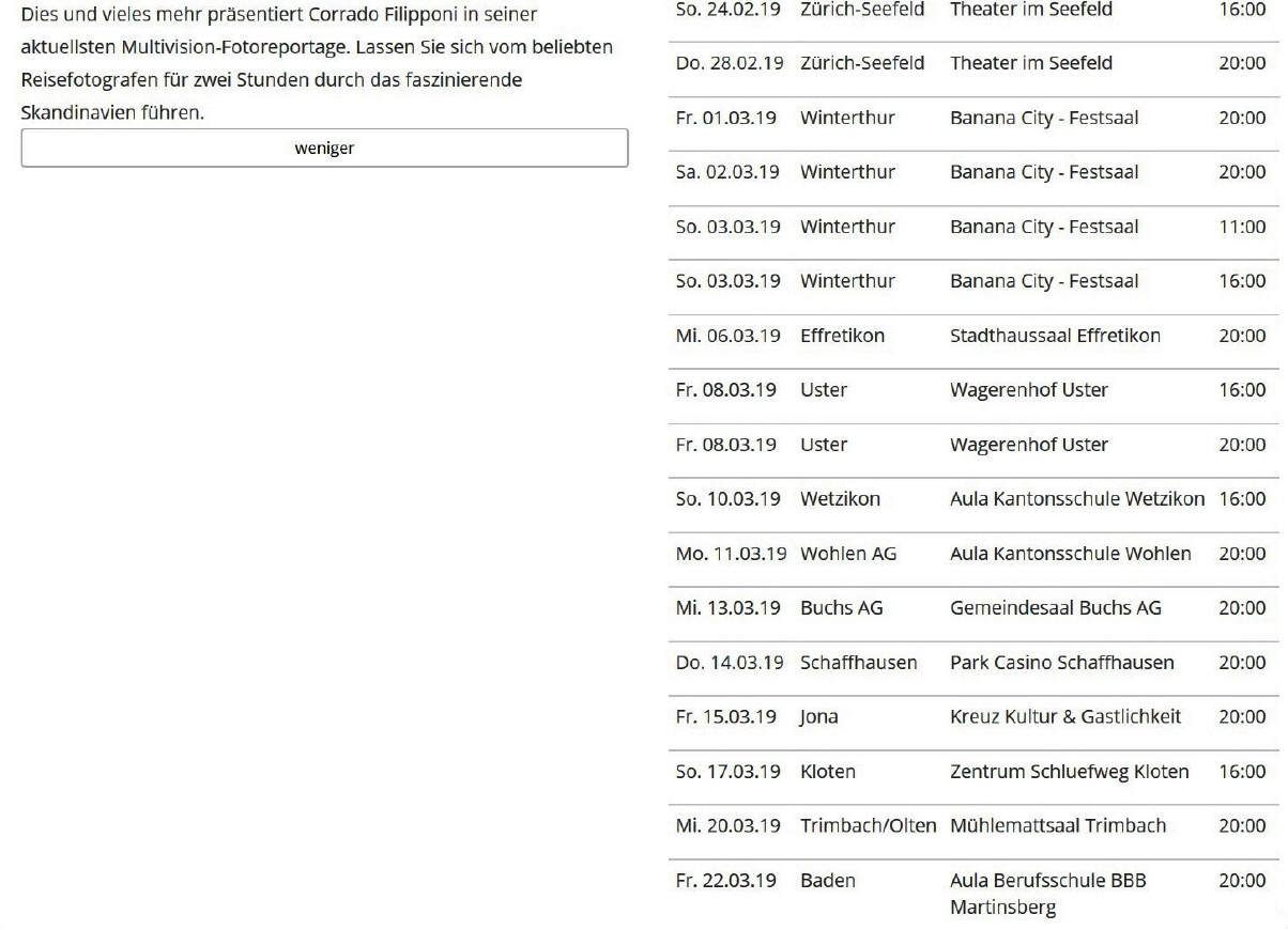Am Mittwoch, 6.März besuchte ich zusammen mit Milly die neue Schau von Corrado: Milly, die vor Jahren mit ihrem Freund Edi die Hurtigrute bereist hat, war ganz begeistert über die Schau. Ich selbst war am 15.8.1979 am Nordkapp, damals mit meiner ersten GoldWing, und kannte auch viele der Orte, die an diesem Abend vorkamen. Corrado ist ein begnadeter Fotograf: Er zeigt wunderbare Bilder, Filme mit toller Musik und gibt entsprechende Tipps, die den Zuschauer eventuell Ideen für Ferienreisen wecken - er zeigt wunderbare Orte, an die normale Reisende nie hinkommen würden. Der Besuch seiner neusten Multivisions-Schau ist in jedem Fall sehr lohnenswert! |