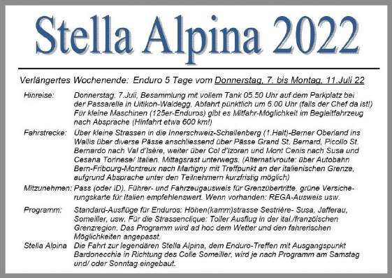 Stella Alpina/ Gelände Dieses speziell für Enduro-Fahrer ausgeschriebene verlängerte 5-tägige Weekend findet jeweils am 2.Juli-Wochenende statt. Die 600 km lange Anfahrt auf Teerstrassen ist landschaftlich wie fahrerisch eine Herausforderung. Dann fahren wir 3 Tage vorwiegend über Kies- und Schotterstrassen, z.T. auf Wanderwegen teilweise bis auf 3000 Meter Meereshöhe. Hinfahrt vorwiegend über Schweiz-Italien, Rückfahrt vorwiegend über Frankreich-Schweiz.