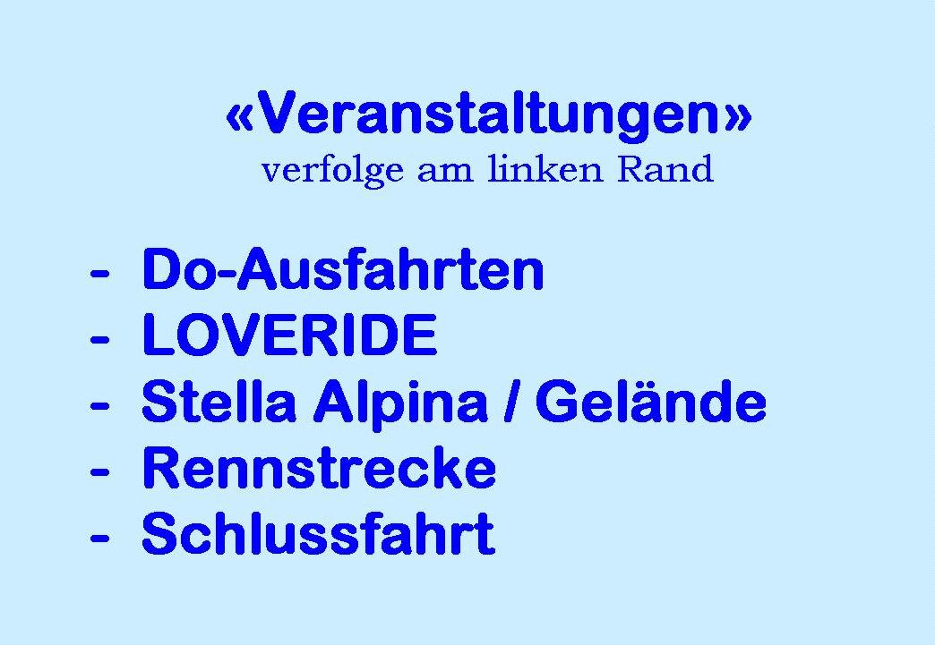 Mangels genügender Teilnehmer/innen ist die «SCHLUSSFAHRT» im geplanten Sinn ABGESAGT: Anstelle werden wir eine «DO-Ausfahrt PLUS» durchführen, die am Sonntag um 11.15 Uhr im Albispass startet.