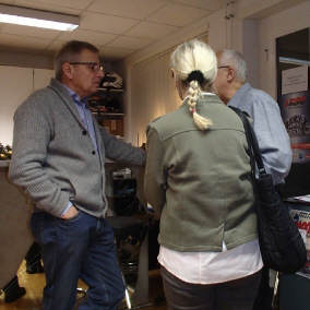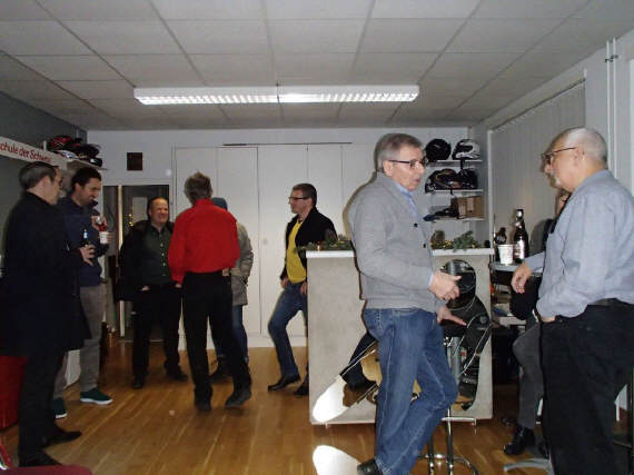 Der Wunsch ging in Erfüllung: Am zweiten Abend kamen deutlich mehr Besucher ... Schon kurz nach vier traf als erster Mike Hill ein, diesmal ohne Familie: Er hat, wie seine Frau Christel, die Prüfung genau im Moment des Umbaus an der Tramstrasse 100 abgeschlossen. Philipp, der als nächster eintrat, war mein erster Fahrschüler dieses Jahres, der mit seinem Grossroller die Prüfung bereits absolviert hat. Nach und nach trudelten weitere Gäste rein, Kunden von 2019 genauso wie andere, die seit Jahren treue Teilnehmer sind. Wir hatten alle Hände zu tun. Auch an diesem Abend wurde der Käse sehr gelobt, so gingen alle wieder zufrieden nach Hause.
