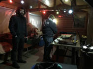 Gregor und Urs waren in der Zwischenzeit soweit, die hungrige Mannschaft zu versorgen: Milly und ich zogen es aber vor, im Lokal an der Wärme zu essen. Nach und nach kamen weitere Gäste dazu. Die beiden Damen zeigten Härte, zogen sich warm an und leisteten während ihrem Nachtessen im kalten Blockhaus Urs Gesellschaft. Er war am ersten Abend eigentlich unterbeschäftigt, schade.