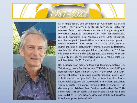 Am 31.März 1977 holte ich meine erste GoldWing beim Honda-Händler Taiana am Seilergraben ab, seit 45 Jahren bin ich auf einer GoldWing unterwegs! Im Mai/Juni 1982 besuchte ich in Wohlen die beiden MR-FL-Seminare, die Weiterbildung zum Motorradfahrlehrer. Seither erteile ich Motorradunterricht, und dies seit 40 Jahren! Am 1.April 1987 eröffneten Küde Bachmann und ich die ERSTE NUR-MOTORRAD-FAHRSCHULE der Schweiz, die ich seit 1991 alleine führe: Seit 35 Jahren also heisst es «Töff, Töff - nüt als Töff!»! Wer hätte das gedacht, dass ich das 35 Jahre-Jubiläum «Tramstrasse 100» feiern darf ...