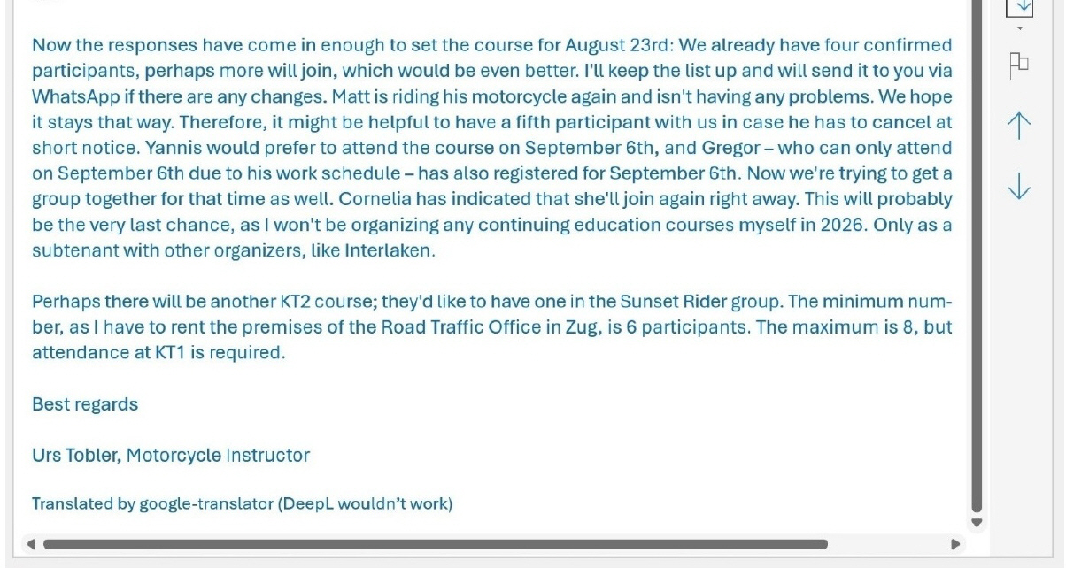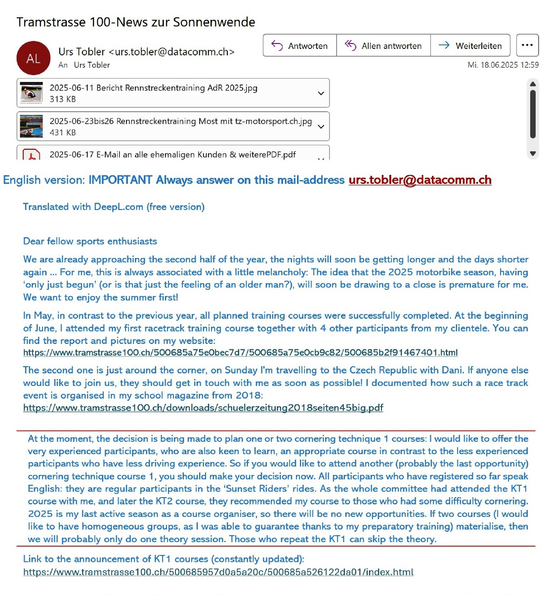 E-Mail v. 20.Aug. 25 wegen KT1 & KT2, Rennstrecke |