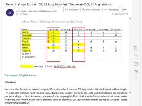Für den 6.Sept. (Stand: 12.8.) sind momentan erst 2 definitive TN, Mindestanzahl liegt bei 4!